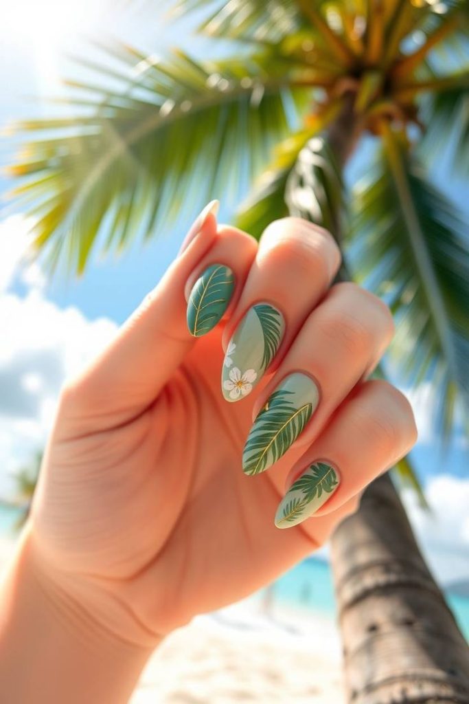 Green monstera and palm leaf designs look stunning over clear or nude polish. Perfect for that ‘I-wish-I-was-in-Bali’ mood.