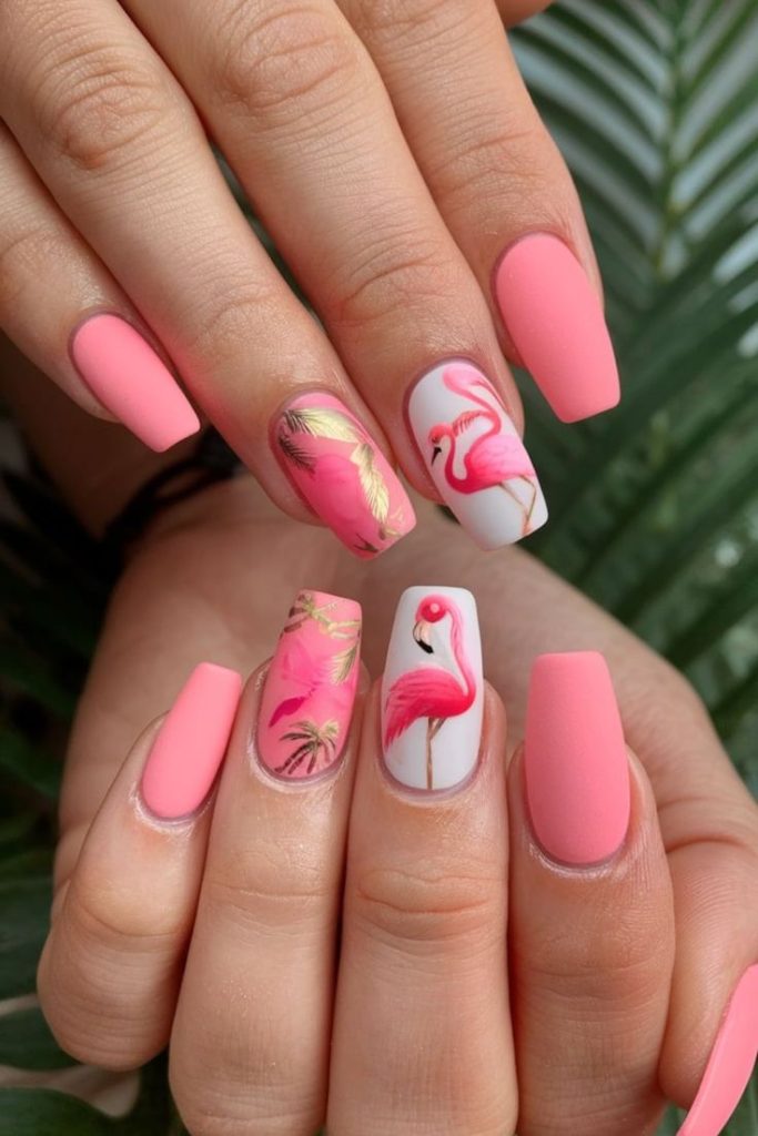 A bright pink flamingo or tropical bird design on one accent nail adds a burst of summer personality. Keep the others tropical for balance.